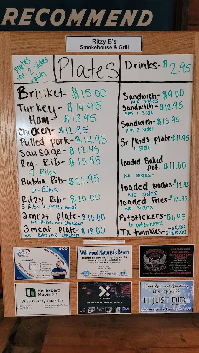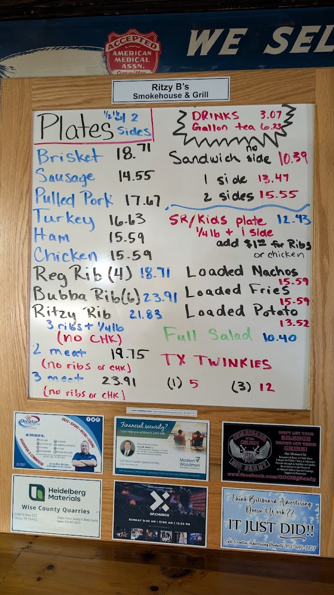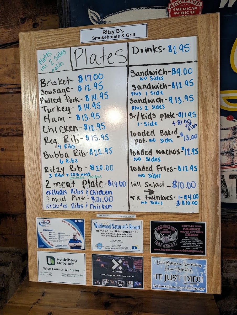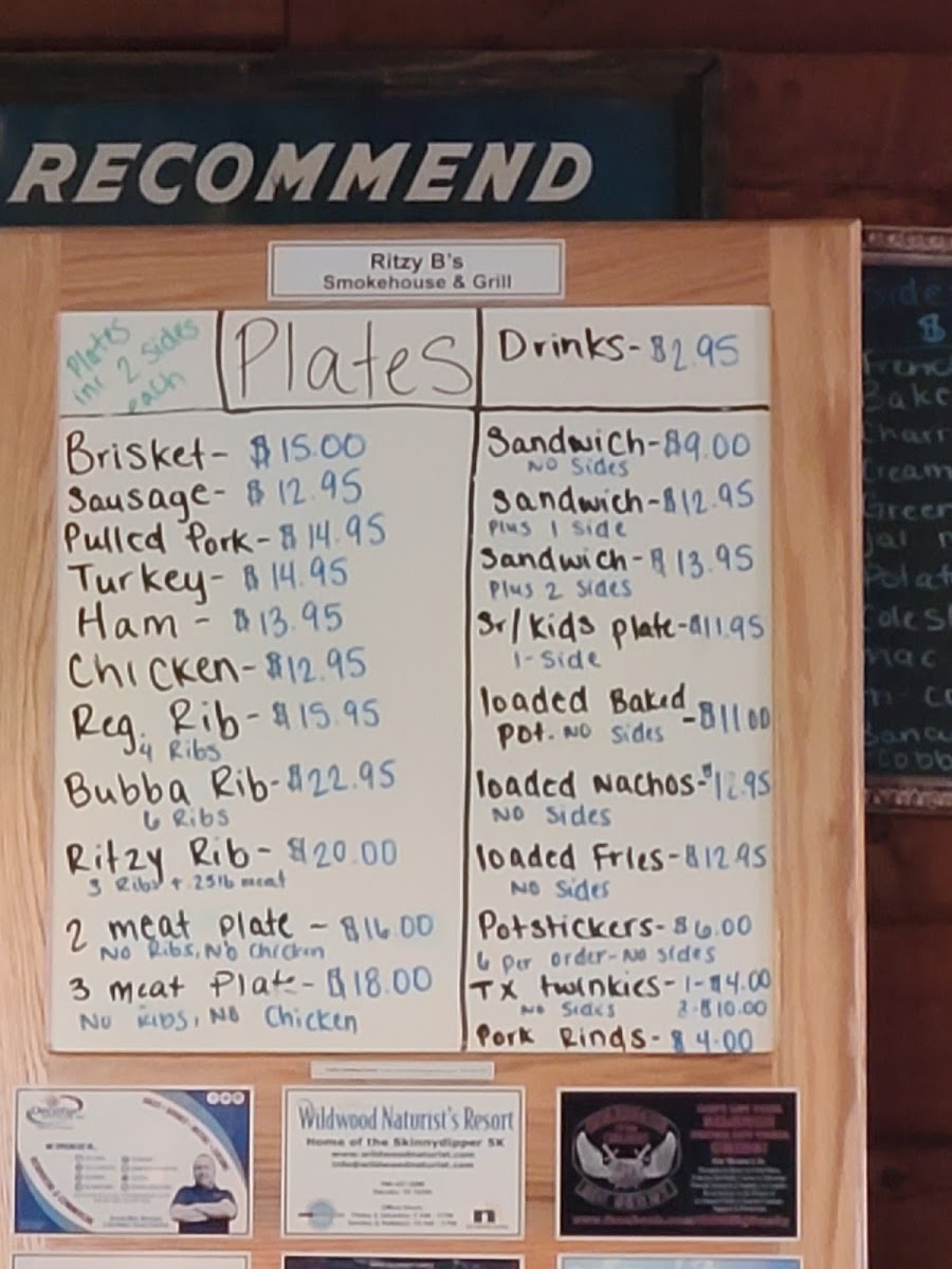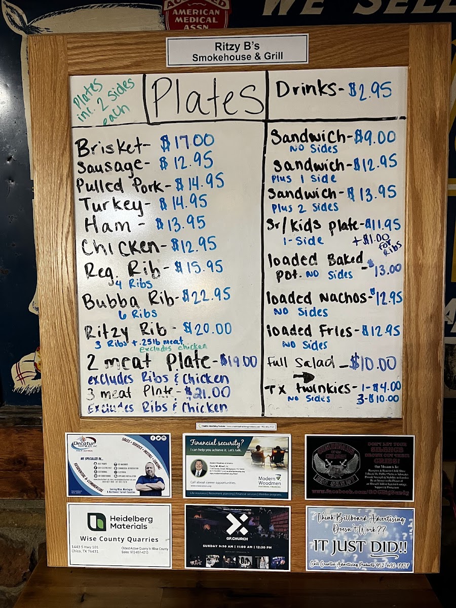 Welcome to Ritzy B's Smokehouse & Grill, where we bring a taste of Texas straight to your table! Nestled at 3142 US-287 in Decatur, TX, our menu is a mouthwatering showcase of smoky delights and hearty comfort food. The star of our lineup is undoubtedly our Beef Brisket Plate, featuring perfectly smoked, moist brisket that melts in your mouth. Be sure to try our Creamed Corn for a side that takes your BBQ experience to the next level. For those looking for variety, the Brisket and Rib Dinner or the Three Meat Plate lets you indulge in a delicious trio of flavors, from tender brisket to juicy ribs and savory sausage. Don't miss out on our Pulled Pork Sandwiches and Loaded Baked Potatoes, either! With options like the Texas Twinkie and Jalapeño Bacon Mac and Slaw, your cravings are sure to be satisfied. Whether you're here for a family meal or a casual night out, Ritzy B's is where smoky goodness meets southern hospitality. Come hungry and leave happy!
